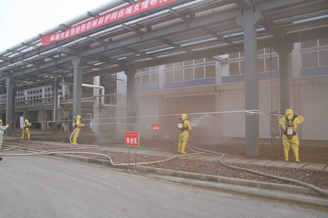 只見(jiàn)噴淋洗消裝置在值長(zhǎng)的指示下及時(shí)開(kāi)啟??傊笓]接到報(bào)告后立即指示啟動(dòng)氯氣泄漏應(yīng)急預(yù)案,并通知公司防護(hù)專(zhuān)業(yè)分隊(duì)至泄漏區(qū)進(jìn)行搶險(xiǎn)救援。隨著現(xiàn)場(chǎng)氯氣的擴(kuò)散,氯堿事業(yè)部的SIS系統(tǒng)自動(dòng)啟動(dòng),液氯泄漏區(qū)的廠(chǎng)房全部自動(dòng)關(guān)閉,氯氣吸收系統(tǒng)自動(dòng)啟動(dòng),將泄漏的氯氣封閉在廠(chǎng)房?jī)?nèi),防止氯氣向外擴(kuò)散。公司對(duì)重大危險(xiǎn)源管控的工程措施在此刻發(fā)揮了重要作用,為應(yīng)急堵漏贏得了時(shí)間。演練中,參演人員各司其職,現(xiàn)場(chǎng)加強(qiáng)警戒進(jìn)行標(biāo)示,及時(shí)疏散人員,快速處置氯氣泄漏,緊急搶救中毒人員,時(shí)刻監(jiān)測(cè)周邊環(huán)境……