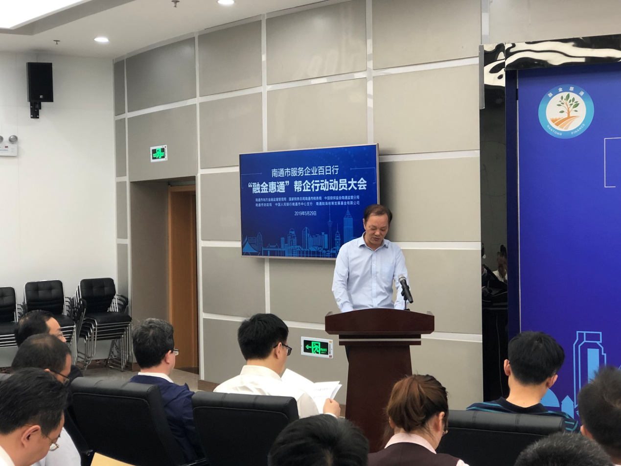 5月29日上午,南通市地方金融監(jiān)督管理局在市中小企業(yè)金融服務中心路演大廳召開“融金惠通”幫企行動動員大會。大會由南通市地方金融監(jiān)督管理局局長張乃華主持,南通市市委常委、常務副市長單曉鳴出席大會并致辭,南通產(chǎn)業(yè)控股集團有限公司副董事長顧建國作為南通陸海統(tǒng)籌發(fā)展基金代表及“融金惠通”幫企行動市直二分隊隊長進行了表態(tài)發(fā)言。