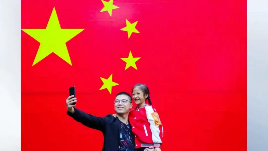 在水繪園風景區(qū),他們看到了一幅巨大的五星紅旗。周啟明拿出手機,拍下自己和女兒與國旗合影的畫面,讓孩子接受愛國主義教育。這時,正好碰上了攝影師徐慧,拍下了這幅幸福溫馨的照片。